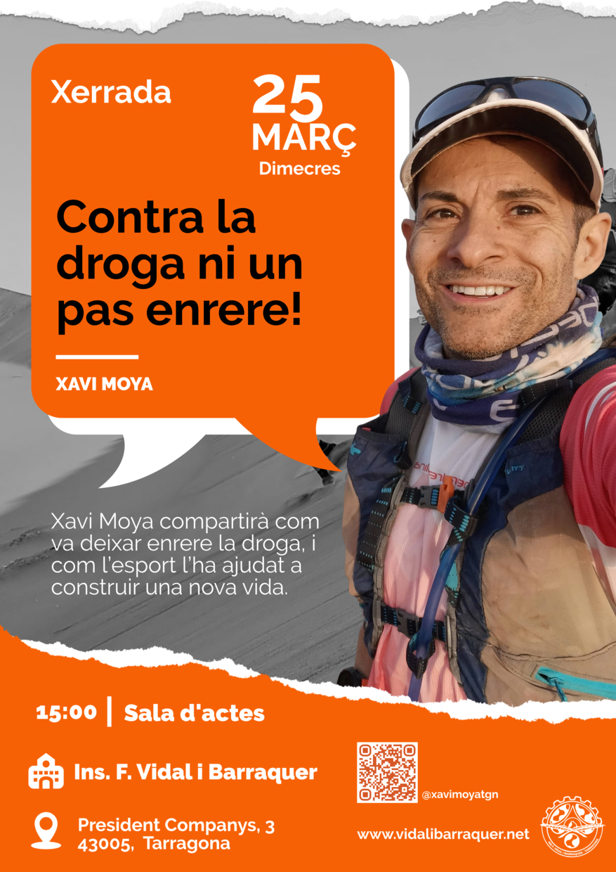 El dimecres 25 de març a les 15:00 h, a la sala d’actes de l’Institut F. Vidal i Barraquer, rebrem la visita de Xavi Moya, tarragoní que compartirà la seva experiència personal superant una addicció i reconstruint la seva vida gràcies a l’esport.